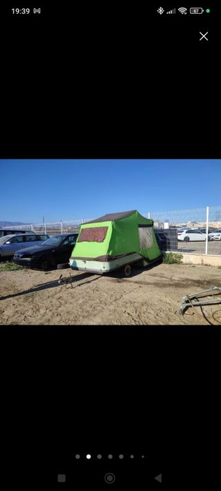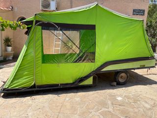 Remolque tienda con 2 habitaciones separadas por cortina medio. avance con lonas palos completo. remolque con rueda recambio y plataforma para llevar nevera o lo que se quiera. se habre en 15 segundos muy practica y lijera. con documentacion pero antigua. factura, honologacion industria y chapa en remolque se vende por tener camper.