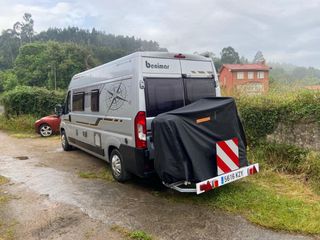 Porta motos diseñado para camper o autocaravana. Permite transportar una moto de forma segura. - Estructura metálica. - Matrícula visible - Instalación en bola de remolque - NO esta homologado. -Aguanta unos 130kg Posibilidad de entregar la moto por 1000€ más