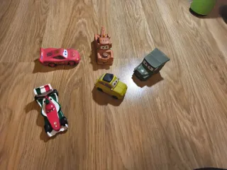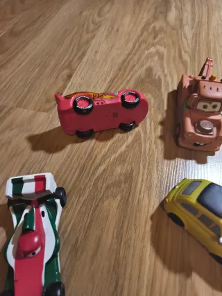 Lote de coches de juguete de goma. - Coche de carreras rojo. - Camión de remolque marrón. - Coche amarillo. - Vehículo militar verde. - Coche de carreras blanco, verde y rojo.