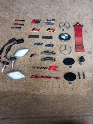 Lote variado de insignias, tapones, tapas lavafaros, luces led, accesorios para coche. - Insignias S-Line (3 unidades) - Insignias FR (2 unidades) - Insignia V6 - Insignia Audi S3 - Insignia BMW - Insignias Mercedes-Benz (2 unidades) - Insignia Type R - Insignia Sport - Insignia irmscher - Tapones negros León fr mk1 (2 unidades) - Accesorios de iluminación LED (2 unidades) - Cinta de remolque OMP roja TAGS: bumper, frente, frontal, paragolpes, bigueta, cupra, parachoques, defensa, fr, arl, cupra, sillones, banquetas, morro, morrera, GTI, S3, R32, rs, gt, rs, gsi, opc, irmscher, kit M, pack M, OEM
