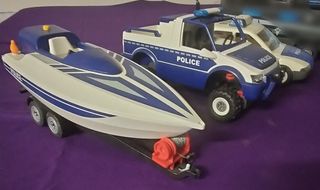 Lote de vehículos policiales. Coche de policía con luces que sí funcionan, también lleva sirena, pero no suena. Modelo 6920. Jeep policial, modelo 5528. No incluye el mando. Lancha de rescate con remolque, modelo 5187. Todos en buen estado. Su precio de venta es del lote. También en venta individuales si se desea, precio a negociar. Únicamente lo que se observa en las fotografías. Si quisieran complementos en especial algunos quizás si tengo. En mi perfil hay más variedad de playmobils publicados.