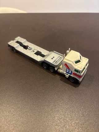 Camión tráiler de juguete de la marca Guisval. Modelo con remolque. - Cabina blanca con detalles en rojo y azul. - Número 23 en la puerta. - Remolque plateado con plataforma.