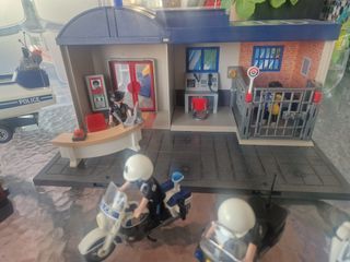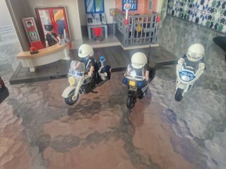 Comisaría Playmobil con todos sus accesorios. Incluye tres motos de policía, coche, dos furgones y una lancha. Está en muy buen estado, ideal para regalar. - Comisaría con celda y sala de recepción. - tres motos de policía - coche de policía. - Dos furgones de policía. - Lancha motora y remolque. - Figuras de policías incluidas. - Todo completo con accesorios.