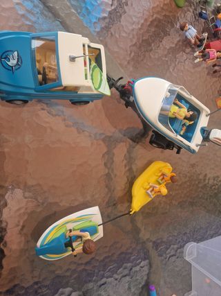 Se vende lote de Playmobil que incluye un coche con remolque para transportar una lancha motora, una moto acuática y figuras. El coche es azul y blanco, la lancha blanca, y la moto acuática azul y verde. Las figuras están en buen estado. ¡Perfecto para jugar a la playa!