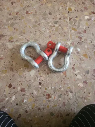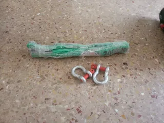 Cuerda de remolque de color verde con dos soportes metálicos en forma de U con tornillos de seguridad. - Cuerda de remolque. - Dos soportes metálicos. - Tornillos de seguridad.