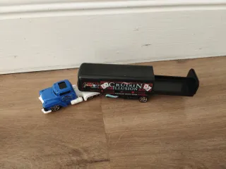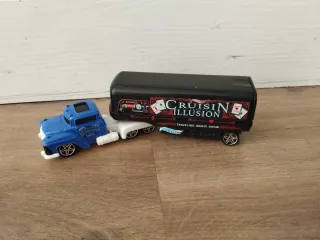 Camión de juguete Hot Wheels con remolque. - Cabina de camión azul. - Remolque negro con diseño de Cruisin Illusion y Traveling Magic Show. - Ruedas plateadas.