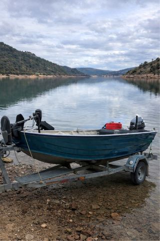 Embarcación de aluminio Kimple azul metalizado ✅Eslora 370 ✅Ancho 150 ✅Motor fueraborda Yamaha 13,5 (15cv) muy poco consumo ✅Remolque Carro con pilotos full led. ✅Entarimada y preparada para la pesca en embalses con tambuchos para guardar objetos ✅Sonda de pesca ✅Motor eléctrico 48 lb ✅Asiento en la parte trasera ✅depósito de gasolina de 20 litros ✅Facil de transportar con cualquier coche Matriculada en la confederación hidrografica del Guadalquivir y con permiso de navegación en mar Se puede probar sin compromiso Pesca black bass lucio kimple bass boat nitro tracker triton