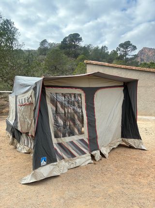 Se vende tienda de campaña para remolque, ideal para acampar. Está en buen estado y lista para usar. - Diseño compacto - Incluye 2 colchones - Instrucciones - Tiene porche y suelo (no se ve en la foto)