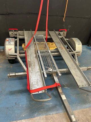 Remolque metálico con capacidad para dos motocicletas. Ideal para transportar tus motos de forma segura. - Estructura robusta de metal. - Rampa central de rejilla. - Soportes delanteros para ruedas. - Correas de sujeción rojas incluidas.