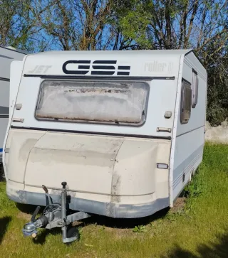 Caravana Roller Jet. Menos de 750kg. Documentación en regla. Con Tarjeta verde. Puede circular. No necesita ITV, ni seguro especial. Simplemente añadir a tu seguro como remolque. La ventana frontal está rota por la zona exterior y abría que arreglarla, de ahí el precio, pero no a afectado a la zona interior. No tiene humedades. La lanzadera es prácticamente nueva. Precio no negociable.