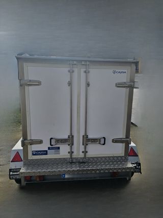 Remolque isotermo de color blanco, ideal para transporte. - Dos ejes. - Dos puertas. - Ruedas en perfecto estado.