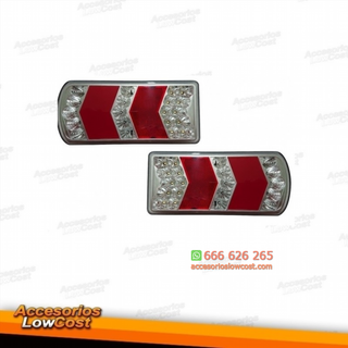 REF: AL021382 Set de dos pilotos LED HOMOLOGADOS de 12/24 voltios. Tienen 7 funciones: luz de posición trasera, luz de freno, luz de intermitente, luz de matrícula, luz de antiniebla, luz de marcha atrás y catadióptrico rojo. Medidas: 22,8 x 10,6 x 4,0 cm. La luz de matrícula está situada en el lado interior de cada piloto. La luz antiniebla está situada en el piloto del lado izquierdo y la luz de marcha atrás está situada en el piloto del lado derecho. Especialmente diseñados para camiones, plataformas y remolques grandes, maquinaria agrícola pesada. Set pilotos led traseros 7 funciones homologado 12/24v