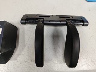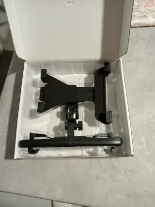 Soporte negro para tablet, ebook, dvd, diseñado para el reposacabezas de un coche. Permite fijar el dispositivo de forma segura. - Soporte ajustable para diferentes tamaños de dispositivos. - Brazo articulado para orientar la pantalla. - Mecanismo de sujeción para el reposacabezas.