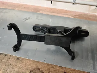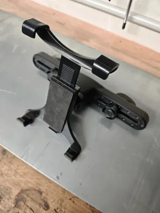 Soporte negro para tablet o móvil, diseñado para el asiento del coche. Permite fijar el dispositivo en el reposacabezas. - Estructura de metal y plástico. - Brazos ajustables. - Base giratoria.