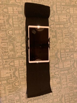 Soporte de tela negra para tablet o el móvil (sin carcasa ni funda), diseñado para acoplarse al reposacabezas de un coche. Ajustable mediante velcro. - Material: Tela. - Color: Negro. - Diseño: Ajustable para tablet.