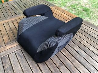 Asiento elevador para coche, diseñado para niños. - Tapicería negra con detalles de puntos blancos. - Reposacabezas integrados a ambos lados.