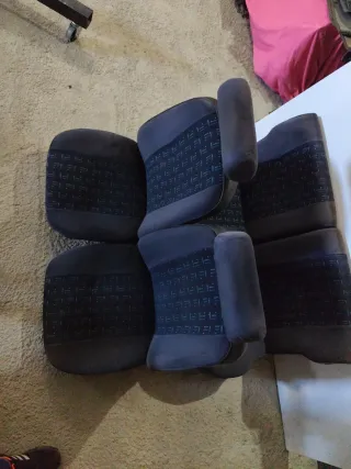 Conjunto de asientos delanteros y traseros para Peugeot 205 modelo Mito. Tapicería de tela con diseño geométrico en tonos grises y azules. - Asientos delanteros con reposacabezas. - Asientos traseros abatibles. No incluye guías sirven para cinco y tres puertas poniendo sus correspondientes guia. Envío aparte de la app preferiblemente en mano o posibilidad de transporte. Más piezas en mi perfil ☺️