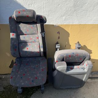 Se venden cuatro asientos individuales para Mercedes Vito W638. Tapicería gris con estampado de figuras. - Asiento con reposacabezas. - Cinturón de seguridad integrado. - Reposabrazos. - Base con ruedas para facilitar el movimiento.