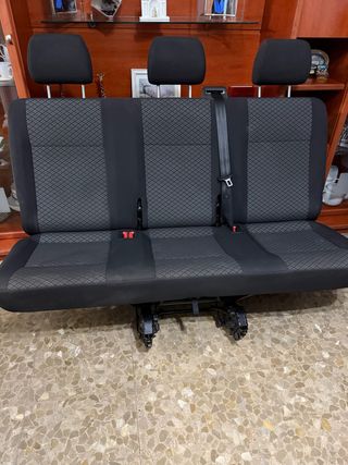 Asiento trasero original de Volkswagen Caravelle. Tapicería en tela gris con diseño. - Tres plazas. - Reposacabezas integrados. - Cinturón de seguridad central. Tapicería en muy buen estado, sin rotos ni desgaste notable. Se desmontó por cambio de configuración del vehículo.