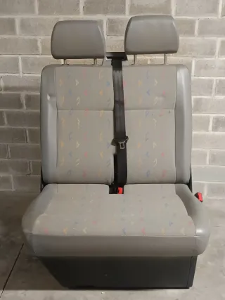 Asientos dobles fila trasera de Volkswagen Transporter T5. Tengo tambien si interesa el asiento individual que completa la fila de 3 plazas. Estan en muy buenas condiciones porque no se han usado Tapicería de tela gris con detalles de colores. - Dos asientos individuales. - Reposacabezas integrados. - Cinturones de seguridad.
