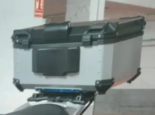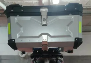 Maleta de aluminio para moto con una capacidad de 65 litros. Diseñada para ofrecer un almacenamiento seguro y resistente. Con solo 3 meses de uso, me la cambio por el color que no le queda bien a la nueva moto. - Material: Aluminio. - Capacidad: 65L. - Color: Plateado con detalles en negro y reflectantes. - Cierres metálicos. - Asa superior para transporte. -Con su base y tornillería incluida.