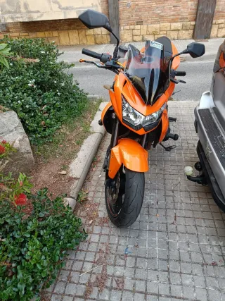 Moto deportiva de color naranja con transmisión manual. - Diseño agresivo y moderno. - Parabrisas oscuro integrado. - Espejos retrovisores negros.