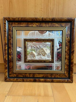 Conjunto de tres cuadros decorativos con espejos. - Grande con caballos: 56,5 x 50,5cm - Mediano con pescadores: 49 x 38cm - Pequeño con casa bosque: 37 x 34cm Los precios en separado son: Grande (20€), mediano (15€) y pequeño (10€). Juntos hago descuento y los dejo por 30€.