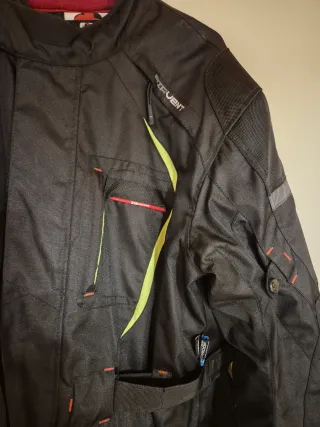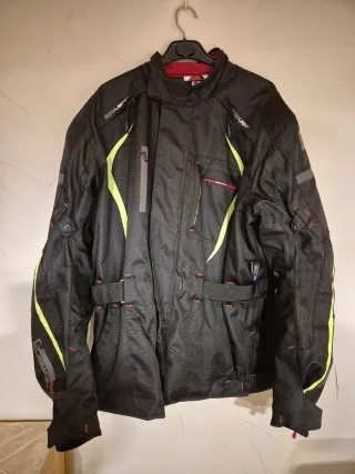 Chaqueta de moto negra con detalles en amarillo y rojo. Diseñada para ofrecer comodidad y protección. Talla L Nueva sin ningún defecto ni rasguño. - Tejido resistente. - Cremalleras y ajustes. - Cuello alto.