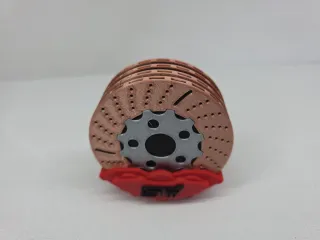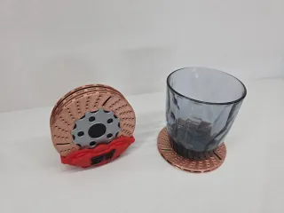 Set de posavasos con diseño de disco de freno de coche de carreras. Realizado con impresora 3d.Material PLA - Diseño de disco de freno perforado y ventilado. - Incluye pinza de freno roja con logo. - Base de disco de metal. - Material de los discos: madera.