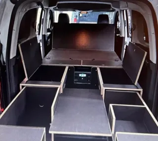 Se fabrican muebles para furgonetas pequeñas tipo Kangoo , berlingo , Fiat doblo , etc ... Con cama de 110 x 190 . Muebles que incorporan espacio de almacenamiento , fogón y pica friegaplatos . Convertible en sofá con mesa elevada y mesa auxiliar extraíble . Multiples combinaciones dependiendo de las necesidades de cada usuario Pide presupuesto sin compromiso.