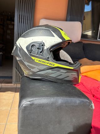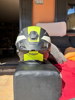 Casco de moto deportivo con diseño moderno y detalles en amarillo y negro. - Acabado en fibra de carbono. - Visera integrada. - Cierre de doble anilla. 80% CARBONO Esta nuevo solo le falta la visera
