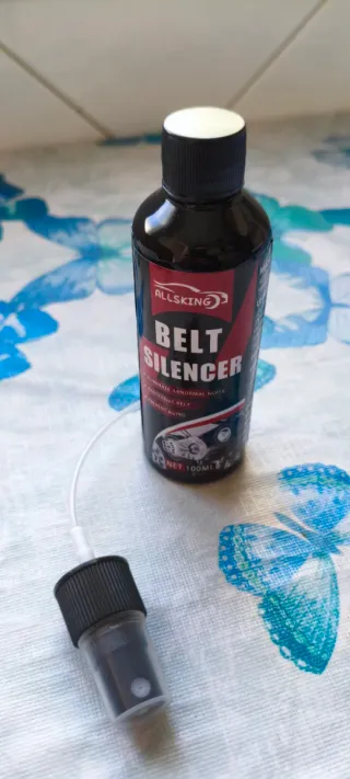 Tratamiento para eliminar el ruido de las correas del motor de tu coche. Ayuda a silenciar chirridos y mejorar el rendimiento. - Marca: ALLSKING - Contenido: 100ml Tratamiento para Correas de Motor - Reductor de Ruido Premium, Disminuye el Ruido y el Desgaste, Restaura la Elasticidad y Flexibilidad, Previene el Envejecimiento y el Agrietamiento. Adecuado para Correas de Motor, Cintas de Correr, Unidades Exteriores de Aire Acondicionado y Otras Piezas de