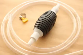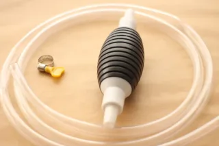 Bomba manual para la extracción de líquidos. Incluye tubo y abrazadera. - Bomba de succión manual. - Tubo transparente. - Abrazadera metálica con tornillo de mariposa.