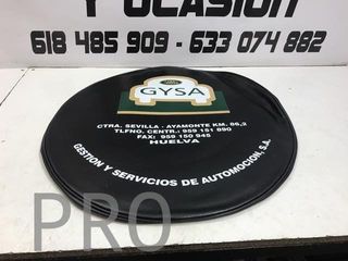 Funda para rueda de repuesto de Galloper 4x4, diseñada por Mitsubishi. Protege tu neumático de las inclemencias del tiempo y el polvo. - Diseño negro con logo Galloper 4x4. - Detalle de ingeniería Mitsubishi. Está usada con usos de desgaste, en buen estado y tapa perfectamente la rueda de repuesto. Procede de un Galloper Excedd del año 1999