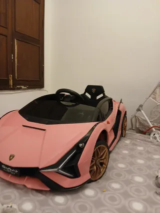 Coche eléctrico para niños, con un llamativo diseño deportivo en color rosa. - Diseño inspirado en un coche deportivo de alta gama. - Ruedas doradas. - Volante y asiento negro.