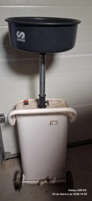 Cuba de recogida de aceite de taller. nueva si usar - Marca Samoa. - Color blanco y negro. - Con ruedas para fácil movilidad.