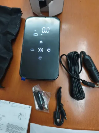 Compresor de aire portátil para ruedas de coche,motos, bicicletas, patinetes eléctricos, balones, colchonetas etc... Incluye accesorios y bolsa de transporte. - Pantalla digital. - Múltiples unidades de presión (PSI, BAR, KPA). - Luz LED integrada. - Cable de carga USB. Como cuando cargas el movil - Adaptadores para diferentes válvulas. - Incluye cable para carga en el mechero del coche ,si se quiere !!