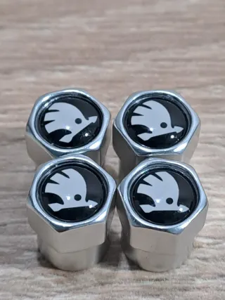 Juego de cuatro tapones para válvulas de rueda de Skoda. Son de color plata con el logo de Skoda en relieve. Ideales para proteger las válvulas y dar un toque personalizado a tus ruedas. - Fabricados en metal. - Diseño elegante y discreto. - Incluye cuatro tapones.