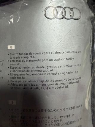 Set de 4 fundas para ruedas de Audi, ideales para el almacenamiento completo de la rueda. - Con asas de transporte para un traslado fácil y cómodo. - Fabricadas con materiales de alta calidad para mayor resistencia. - Incluye un esquema para la correcta asignación de cada rueda. - Bolsa para el almacenaje de los tornillos de la rueda. - Adecuadas para las dimensiones de neumáticos de Audi A1-A6, TT, Q3 y modelos RS.