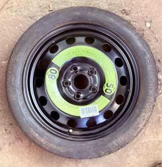 Rueda de repuesto para coche, con indicación de velocidad máxima. - Llanta de acero. - Neumático con etiqueta de velocidad 80. - Medida compacta.