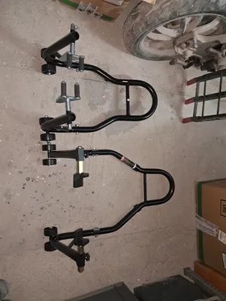 Par de caballetes para moto en color negro. Permiten elevar la moto para mantenimiento o guardado. - Construcción robusta de metal. - Ruedas para facilitar el movimiento. - Soportes ajustables.