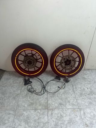 Se vende juego de ruedas completas para moto. Incluye llanta, neumático y disco de freno. - Rueda delantera completa. - Rueda trasera completa.