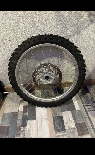 Se vende rueda delantera para moto de enduro KTM. Está en buen estado. En 80/100/21” - Llanta de aluminio. - Neumático con buen dibujo. - Disco de freno incluido.