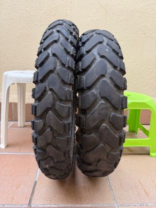 Neumático Mitas Enduro para moto, usado. Ideal para terrenos difíciles. - Medida: 140/80-18 - Marca: Mitas - Tipo: Enduro - Para rueda trasera - Presenta desgaste por uso. 60€ Neumatico Maxxi para moto, poco uso Medida:90/90-21 Marca: Maxxi Tipo: Enduro Para rueda delantera Muy poco uso 40€