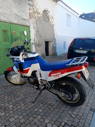Moto Honda África Twin 650, modelo RD03 del año 1989. Un clásico de las trail.moto toda de serie - Diseño icónico en blanco, azul y rojo. - Ruedas mixtas para carretera y caminos. - Cúpula alta para mayor protección se entrega aparte de la de serie y baúl azul beige de la época o negro a gusto .