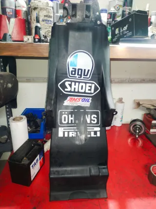 Guardabarros trasero de plástico negro con pegatinas de marcas reconocidas. Año 2008 Se hacen envíos Más piezas en mi perfil Tiene unos agujeros de un porta matrículas no original - Pegatina AGV. - Pegatina SHOEI. - Pegatina Öhlins. - Pegatina Pirelli.