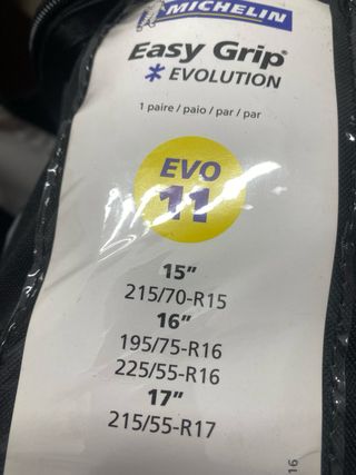Cadenas para la nieve Michelin Easy Grip Evolution, tamaño 11. Diseñadas para condiciones extremas y fácil instalación. Ruedas admitidas en la segunda foto - Estructura composite. - Homologadas. - Velocidad máxima: 40 km/h.