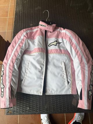 Chaqueta de motorista Alpinestars para mujer en colores rosa y blanco. - Diseño con detalles de la marca Alpinestars en mangas y pecho. - Cuello alto con cierre de velcro. - Cremallera frontal. - Dos bolsillos laterales con cremallera. Con protecciones usada una vez.