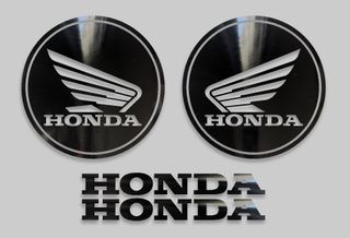 Kit de pegatinas con el logo de Honda, ideal para motos y scooters. - Diseño circular con el ala y el nombre de Honda. - Incluye varias pegatinas de diferentes tamaños. - Acabado brillante.