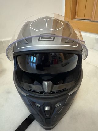 Casco integral para moto con un diseño moderno y detalles gráficos. - Acabado mate. - Visera transparente. - Diseño con líneas geométricas en gris y blanco. Talla M.